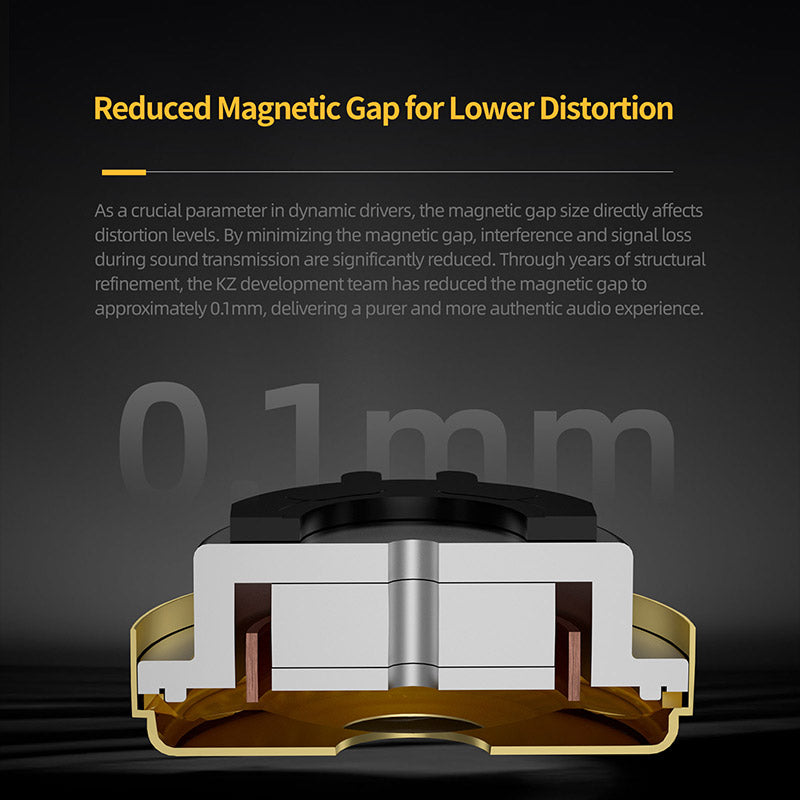 A key factor in dynamic driver performance, the magnetic gap size directly influences distortion levels. Through years of refinement, the KZ development team has minimized the magnetic gap to just 0.1mm, significantly reducing interference and signal loss for a purer, more authentic sound.