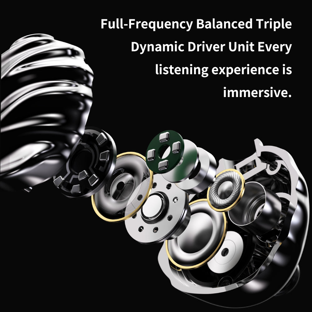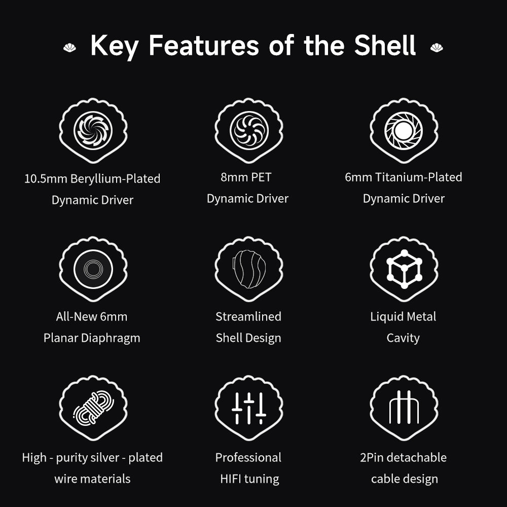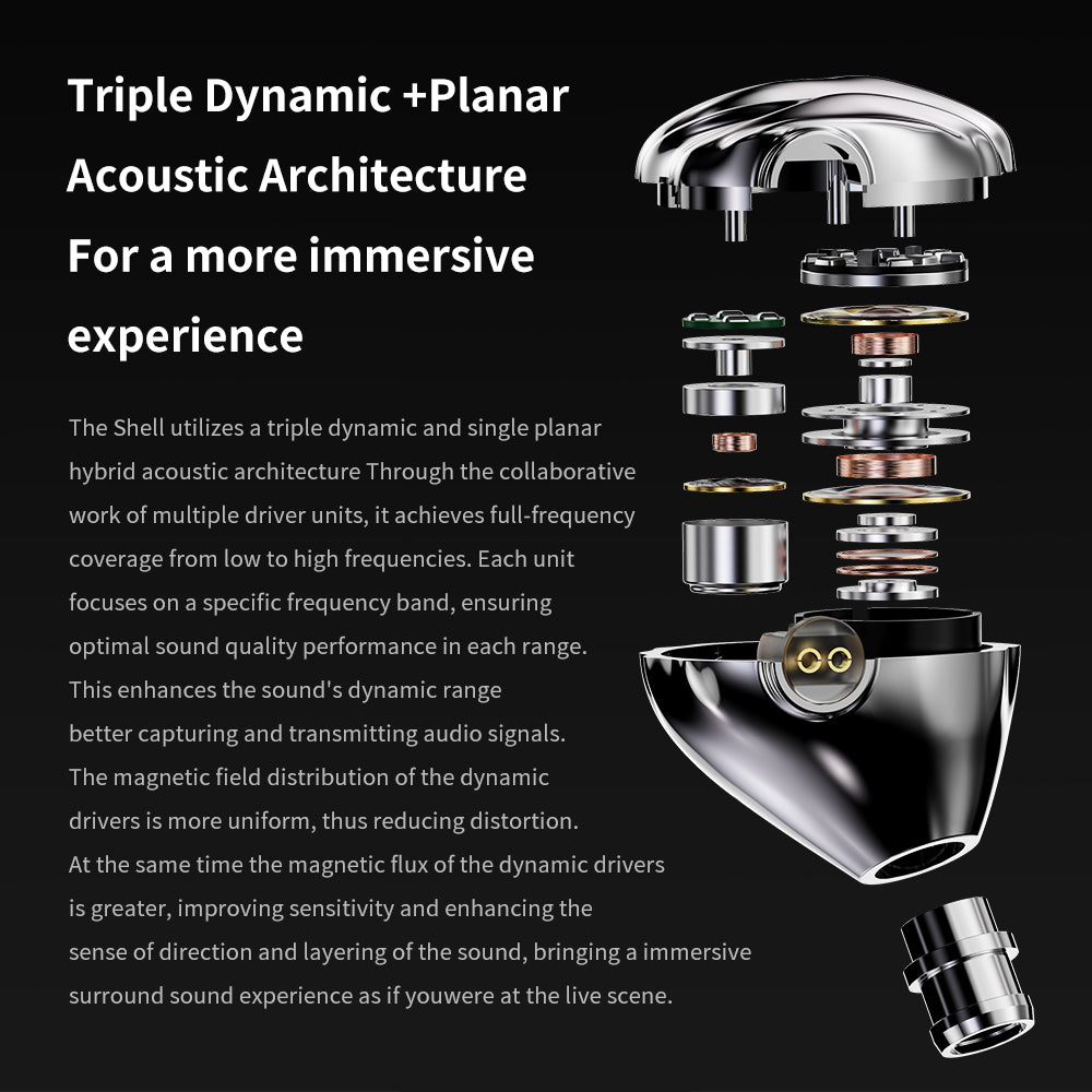 The TRN SHELL features a unique combination of three dynamic drivers (10.5mm, 8mm, and 6mm) and a 6mm planar diaphragm unit. This hybrid design ensures full-frequency coverage, delivering a powerful bass, transparent midrange, and clear treble, all while preserving the integrity and clarity of your music.